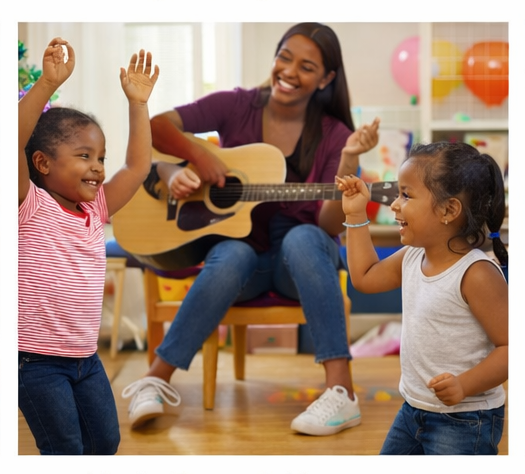 Fun sessions involving singing, clapping, simple instruments, and movement to develop listening skills, rhythm, confidence, and self-expression.